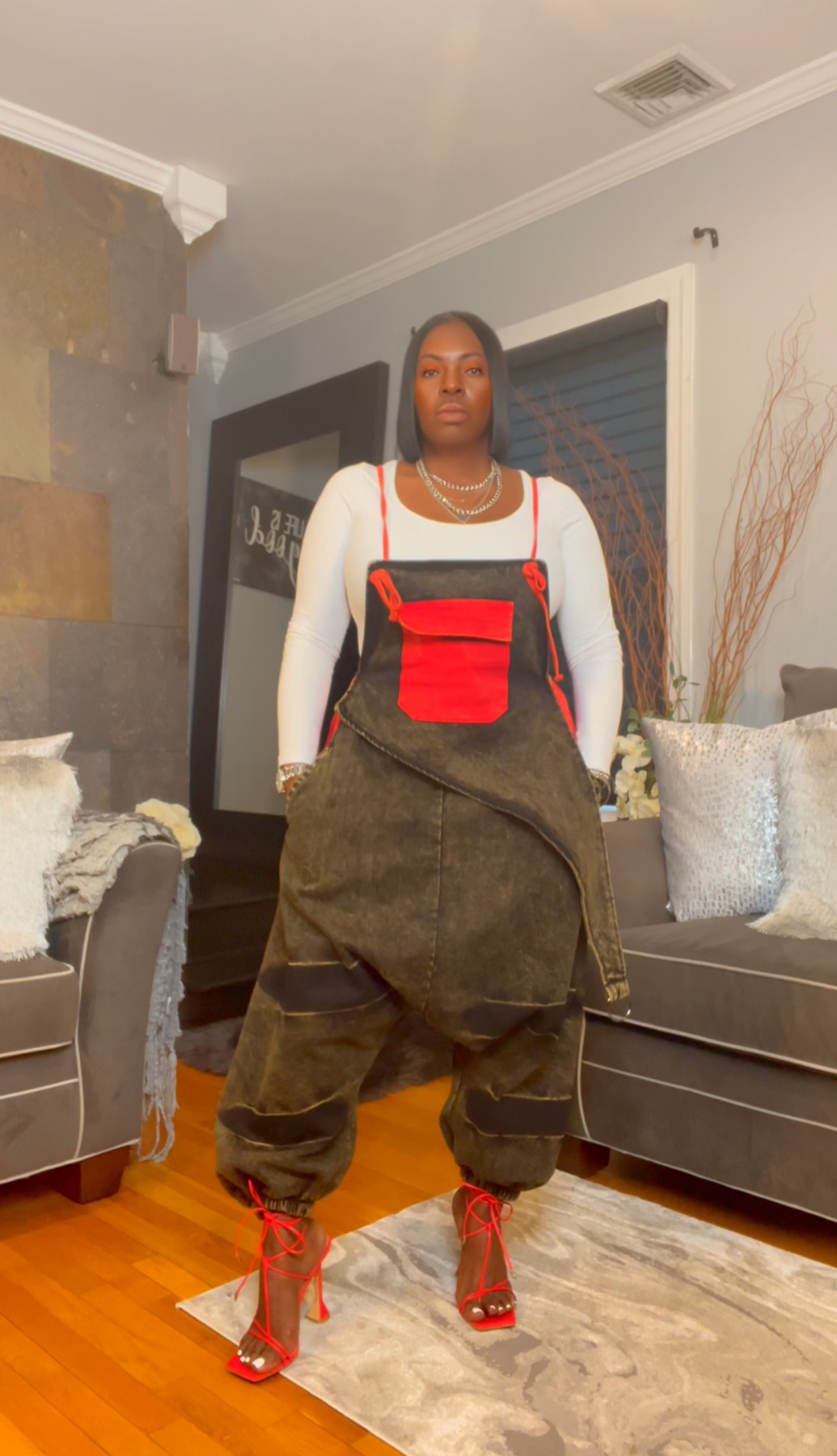 When bold meets streetwear—Zamirah in red shuts it down. This slouchy denim jumper fuses edgy design with confident flair, featuring an apron-style front pocket, deep wash finish, and exaggerated drop-crotch silhouette that’s pure attitude. ❤️🔥