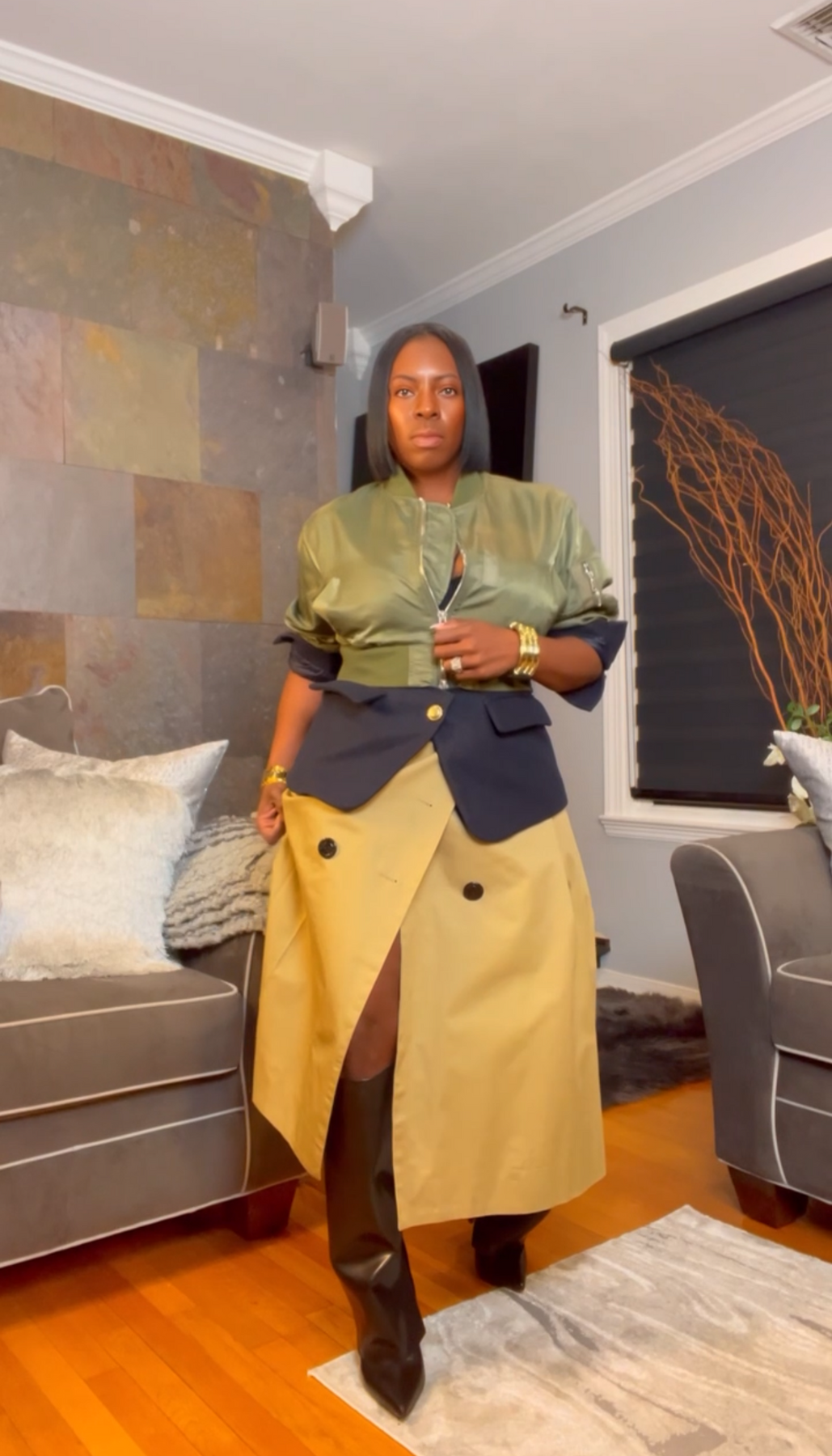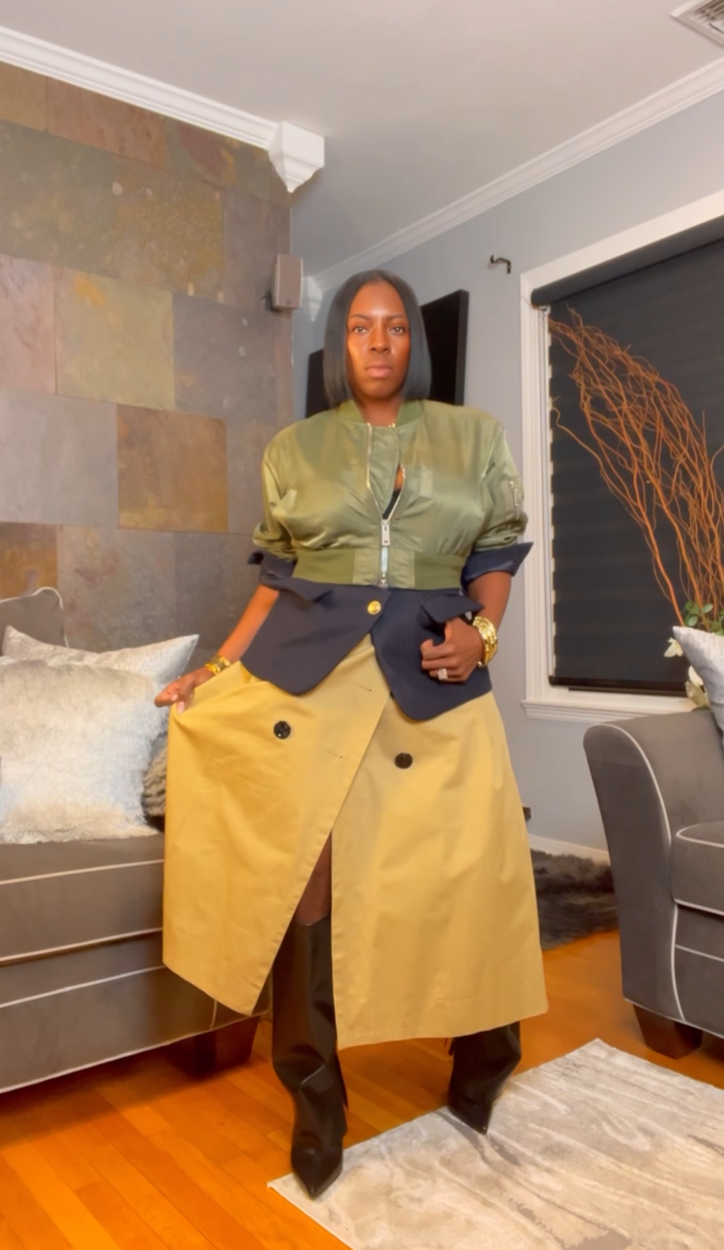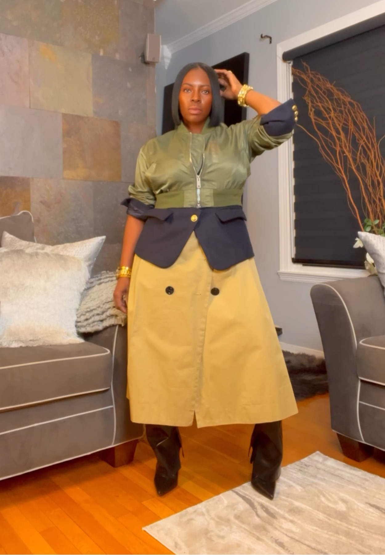 This hybrid blazer trench coat brings three worlds together: the tailored polish of a blazer, the sleek edge of a bomber, and the timeless structure of a trench. Designed in an olive, navy, and tan palette, it creates a striking layered illusion that redefines what outerwear can be.