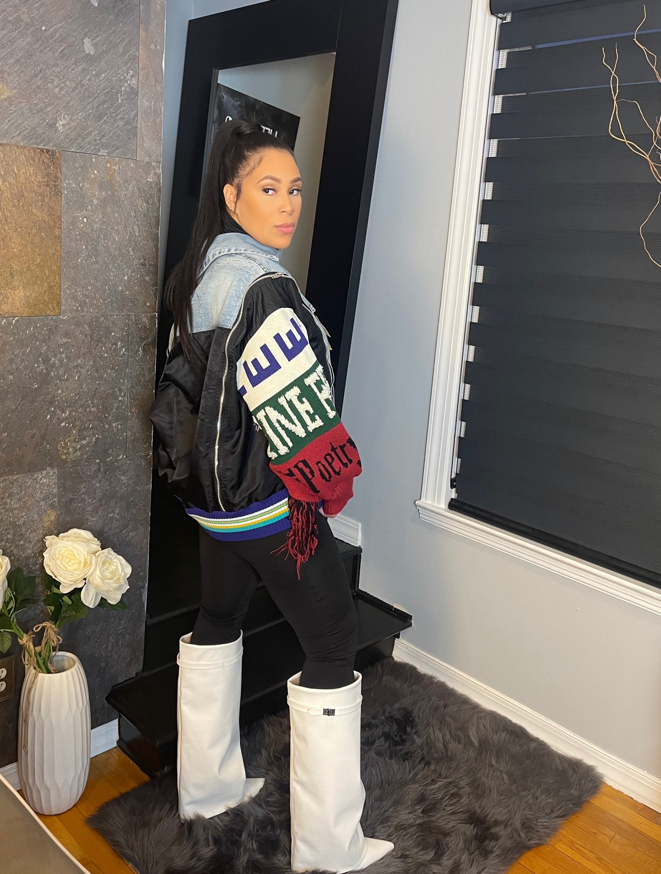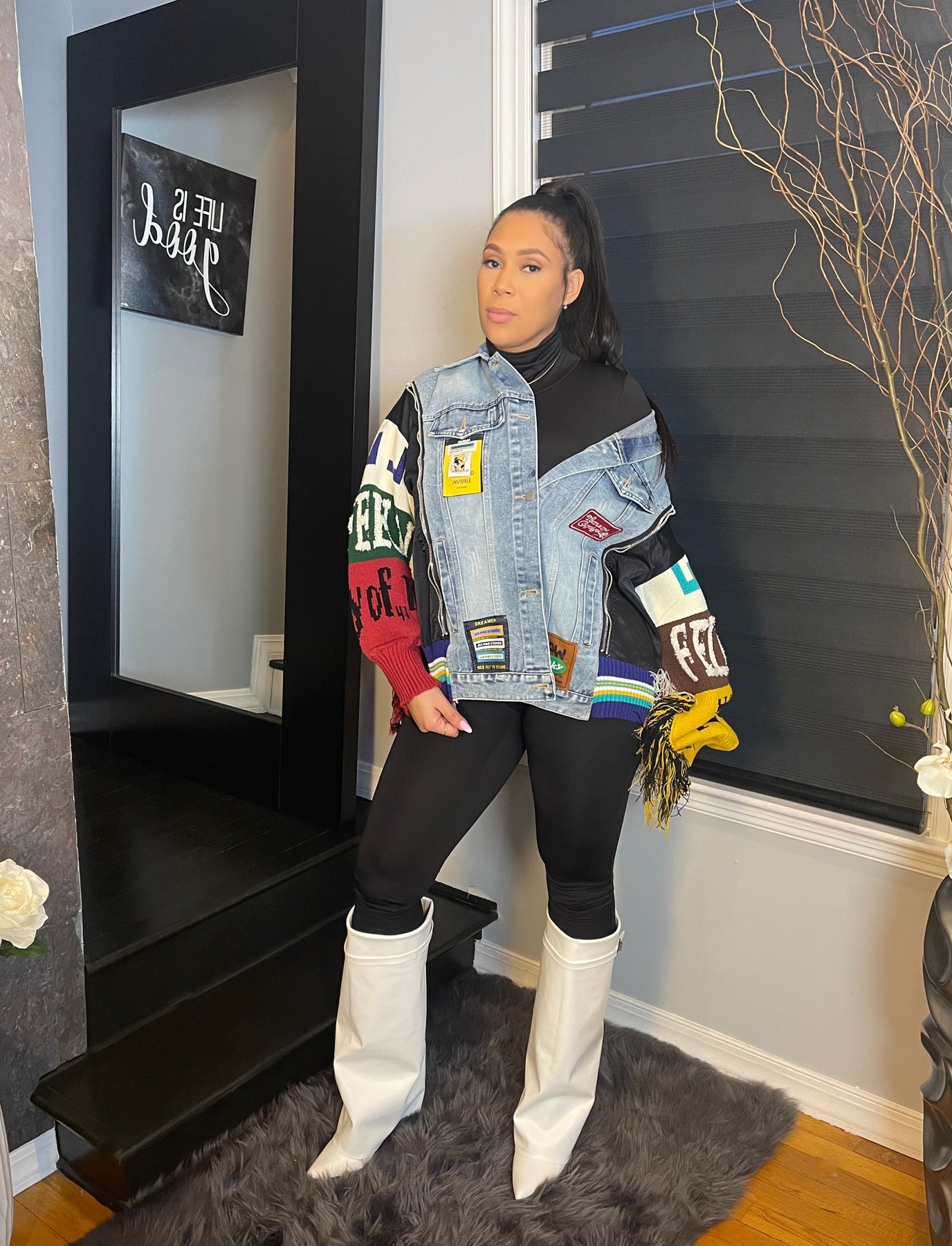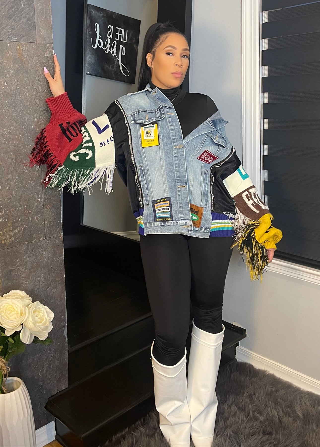 This isn’t your typical denim jacket—it’s a whole vibe! The "Urban Royalty" Denim Jacket takes streetwear to the next level with its perfectly distressed denim core and bold knit sleeves that demand attention. The colorful lettering and fringe detailing bring just the right amount of drama, while the mixed-material design adds texture and depth. Throw it over your favorite fitted look or keep it casual with leggings and boots—either way, you’re giving main character energy. This piece isn’t just a jacket; it’s your new statement-making essential.