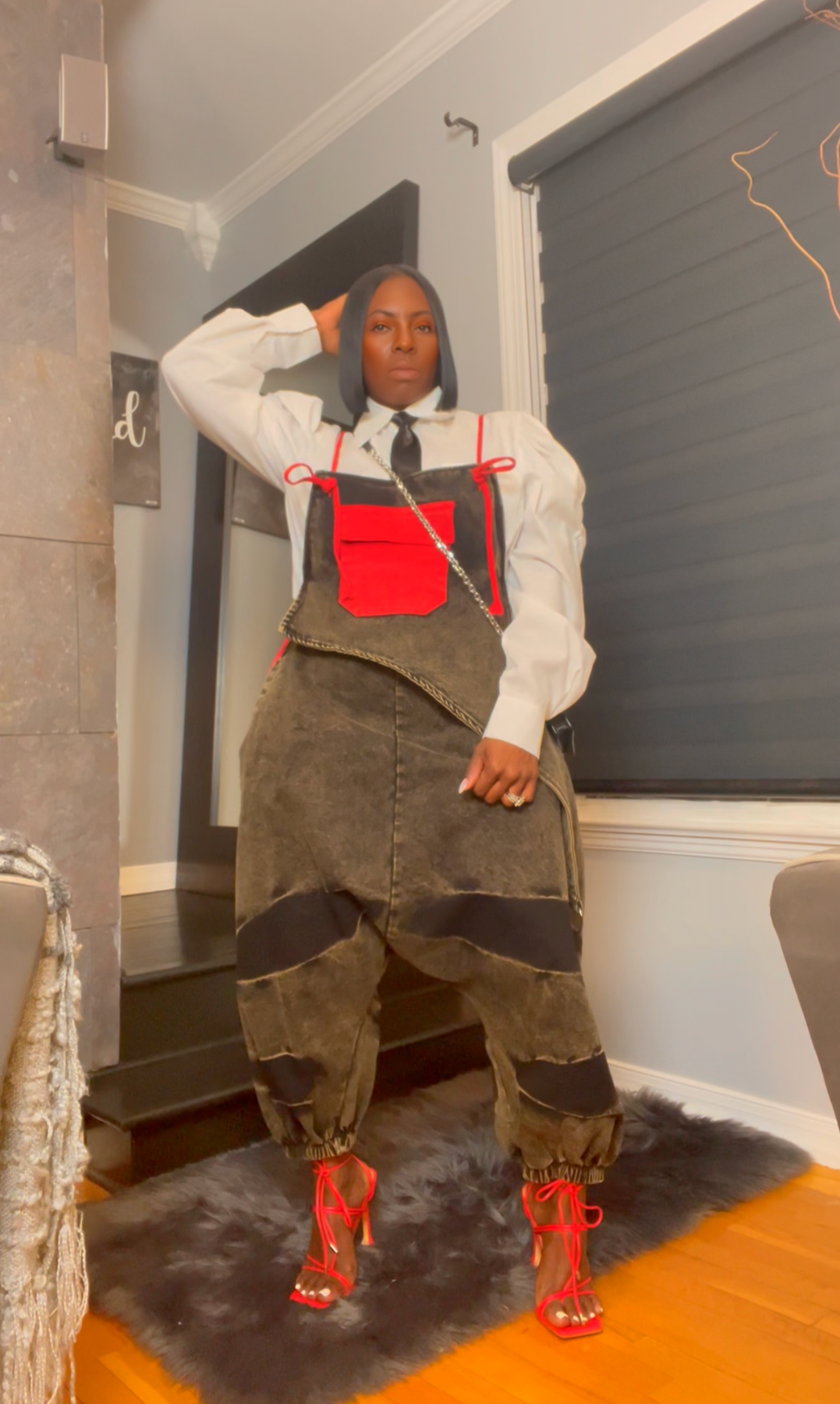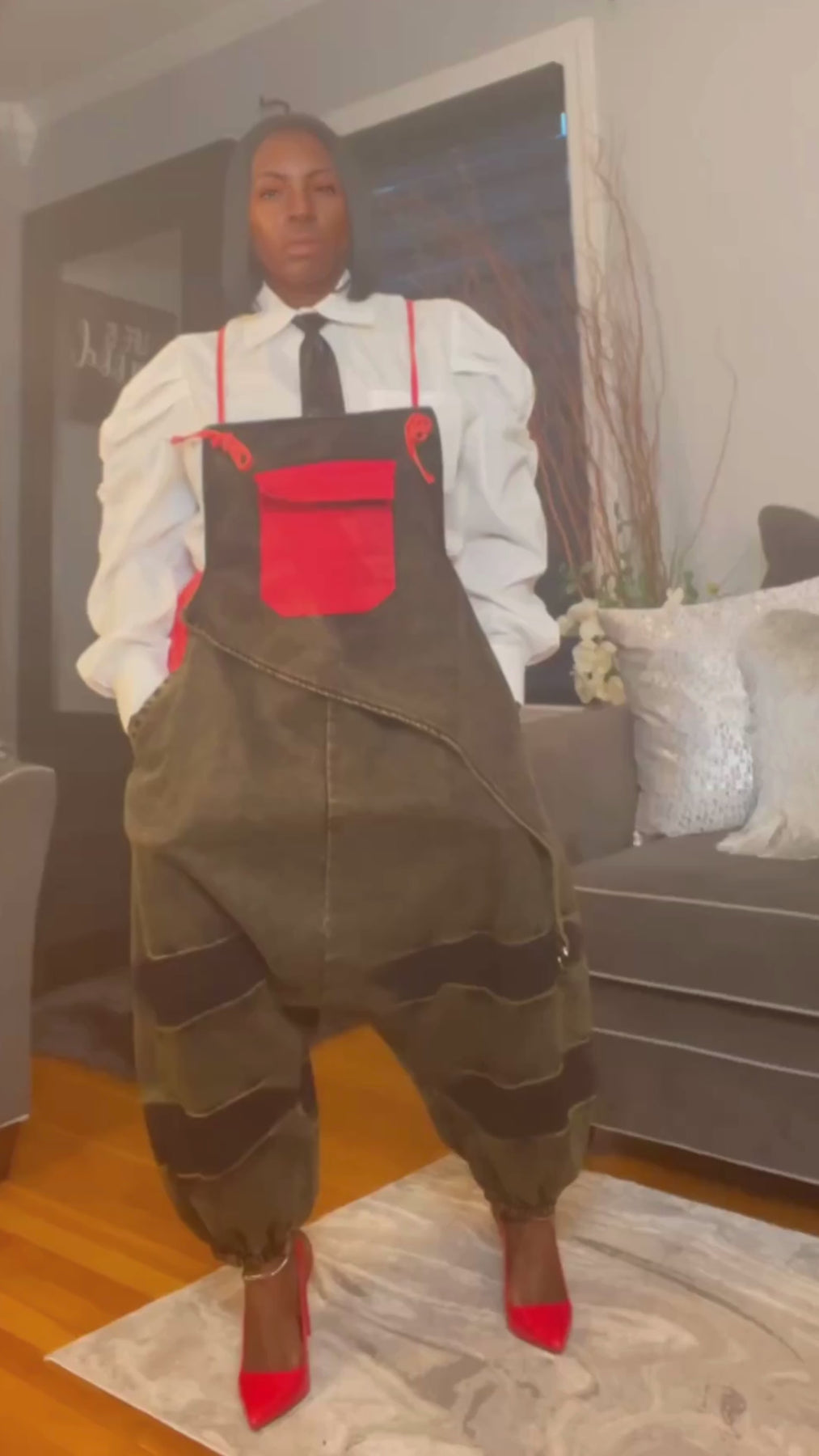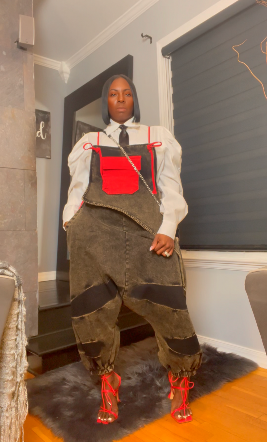 When bold meets streetwear—Zamirah in red shuts it down. This slouchy denim jumper fuses edgy design with confident flair, featuring an apron-style front pocket, deep wash finish, and exaggerated drop-crotch silhouette that’s pure attitude. ❤️🔥